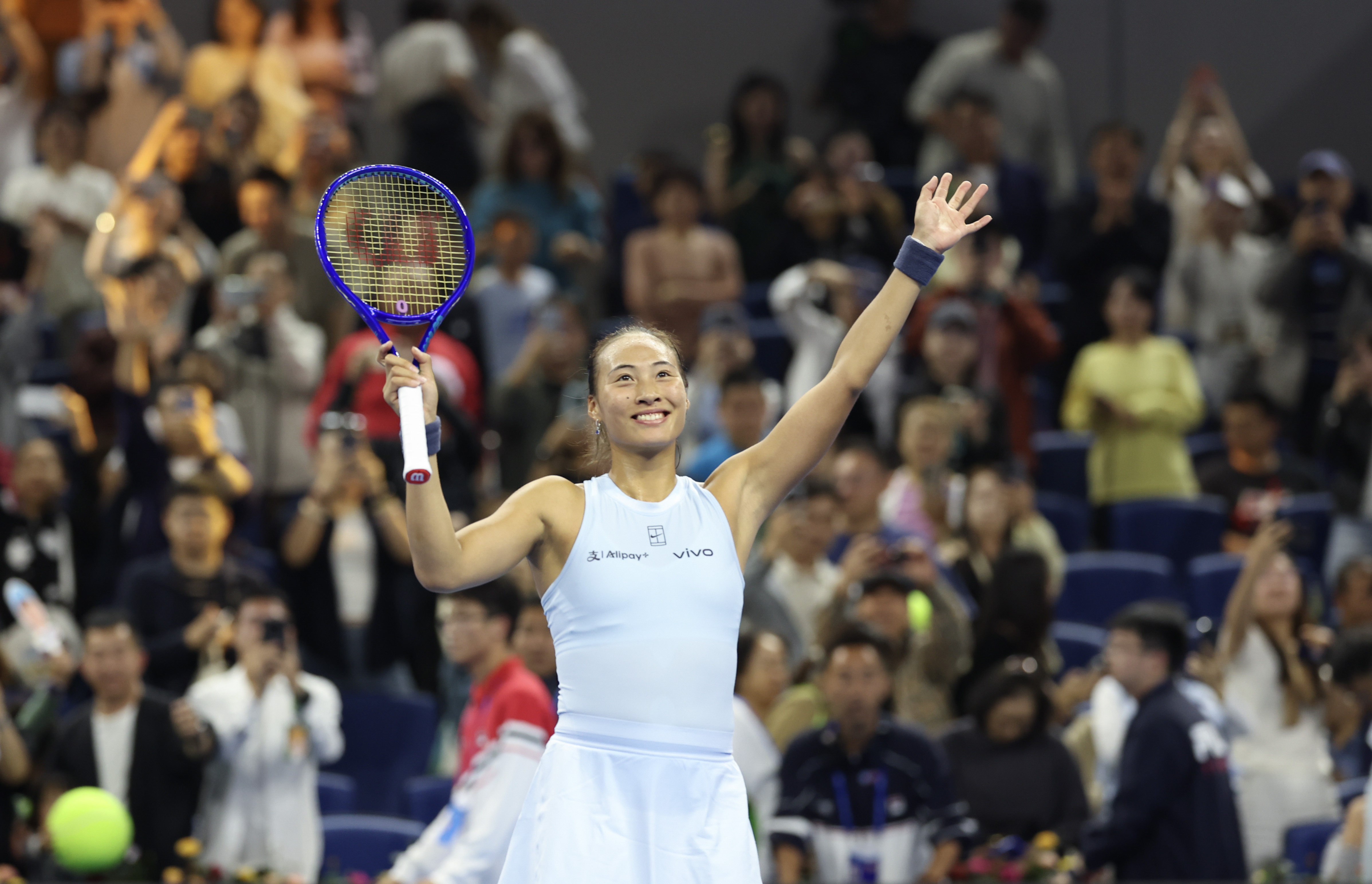 9月27日,郑钦文在比赛后庆祝。新华社记者 白雪飞 摄